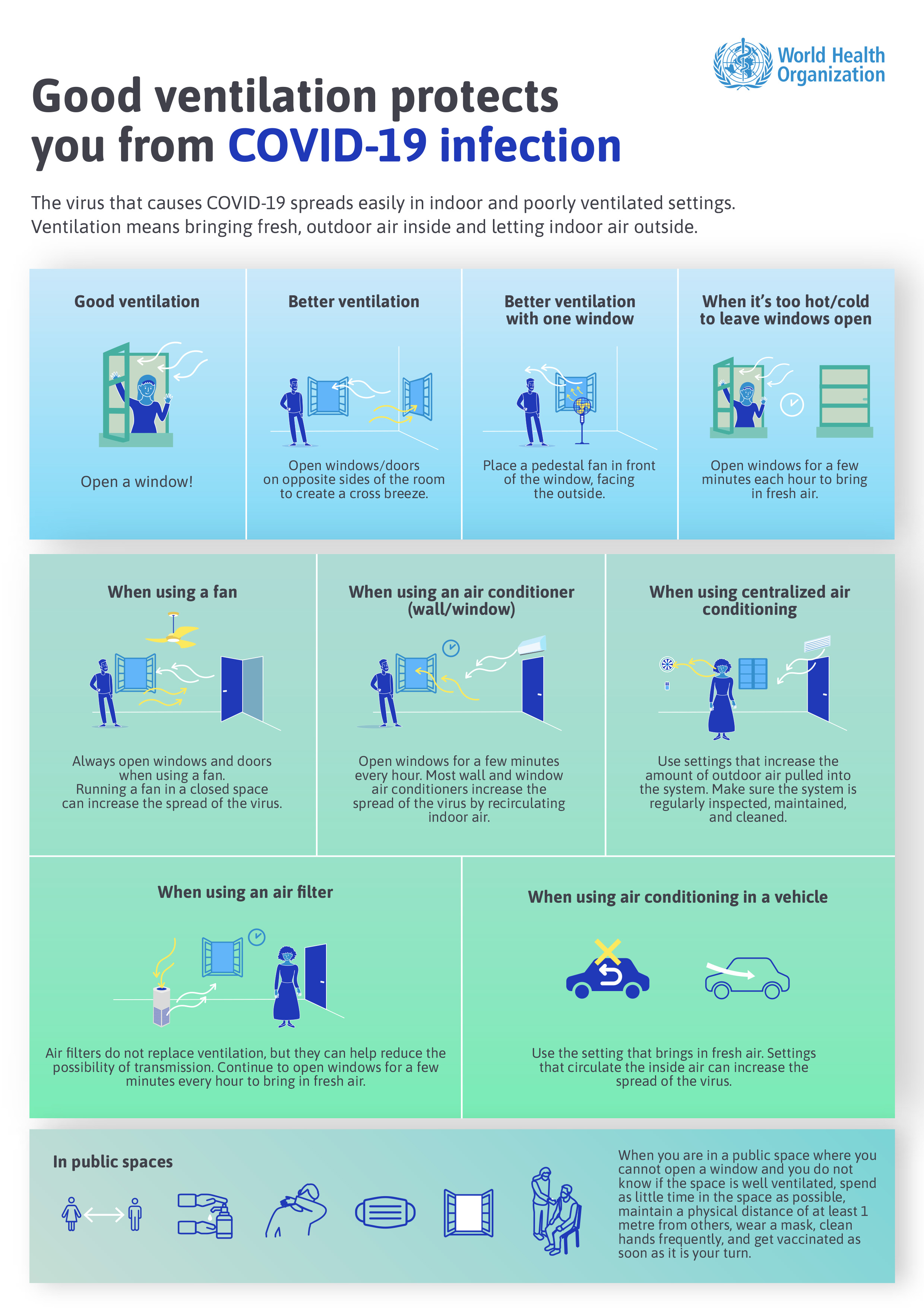 La ventilación no es una medida independiente, por lo que debería aplicarse como parte de un conjunto integral de medidas, tales como mantener el distanciamiento físico, evitar lugares concurridos, utilizar mascarilla, lavarse frecuentemente las manos, quedarse en casa en caso de encontrarse mal, taparse la nariz y la boca al toser o estornudar con la parte interior del codo flexionado y vacunarse. Cada una de ellas es importante como medida de protección contra la infección por el virus de la COVID-19. Puede obtener más información sobre cómo protegerse en nuestra página de orientaciones para el público.