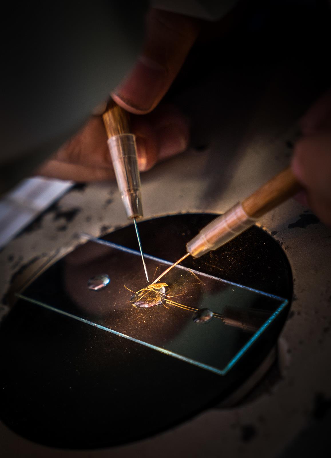 A researcher dissects a mosquito under the microscope at the Malaria Research Centre in Khanh Vinh district