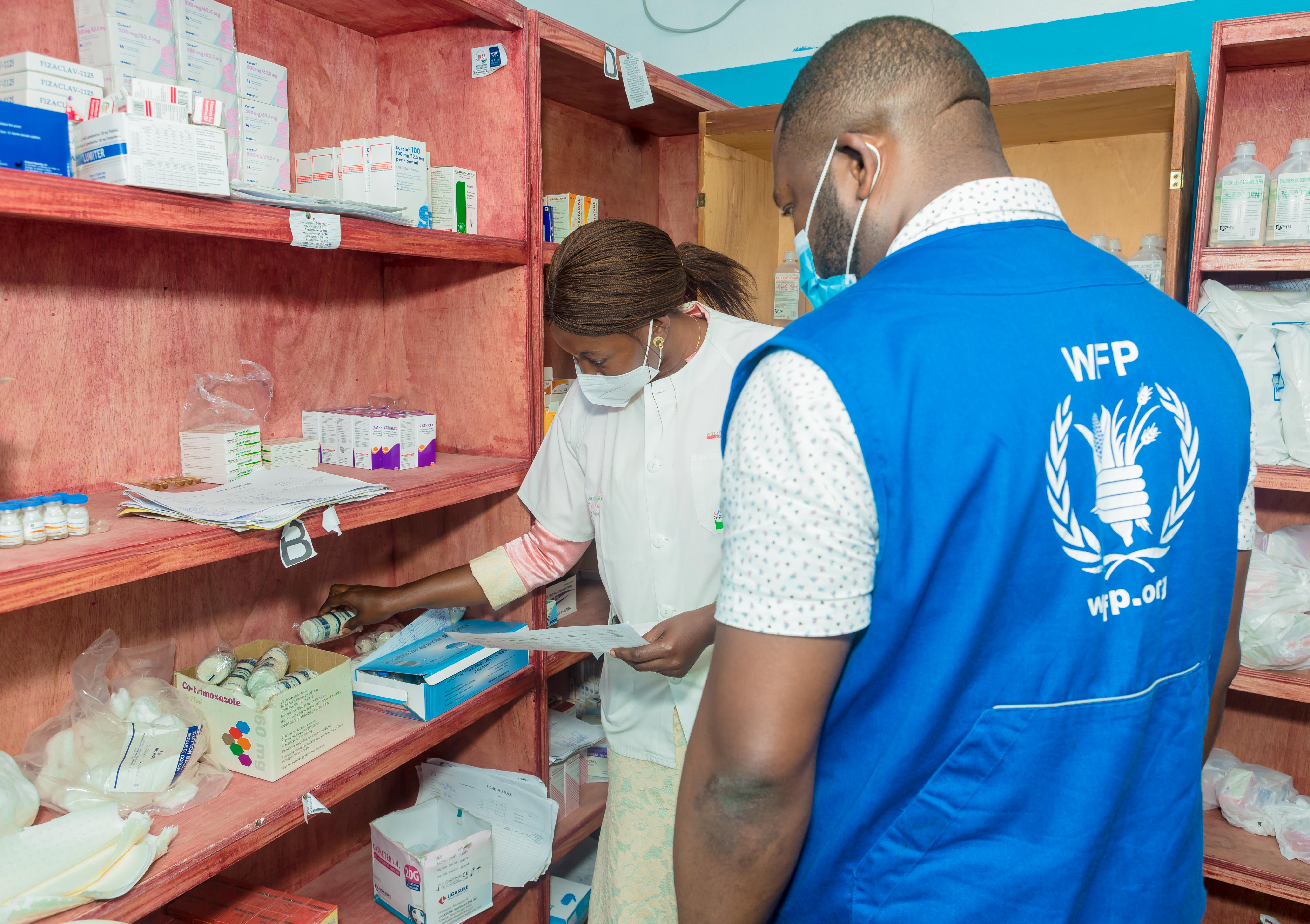 WFP staff member working with a member of the Cote D’Ivoire Medical Store inspecting supplies for distribution and treatment in the local community. ©WFP/SAPH/2021