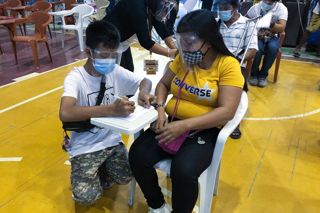 Arlene Barrios, a blind massage therapist, is assisted by her son in completing a form before she receives her COVID-19 vaccine. © WHO Philippines