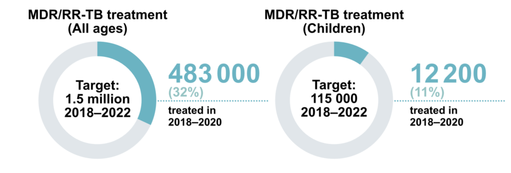The cumulative total number of people reported as enrolled on treatment for MDR/RR-TB from 2018 to 2020 was 482 683, only 32% of the 5-year target (2018-2022) of 1.5 million that was set at the UN high-level meeting on TB in 2018 (Fig. 3.4.3). For children specifically, the cumulative number was 12 219, only 11% of the 5-year target of 115 000.
