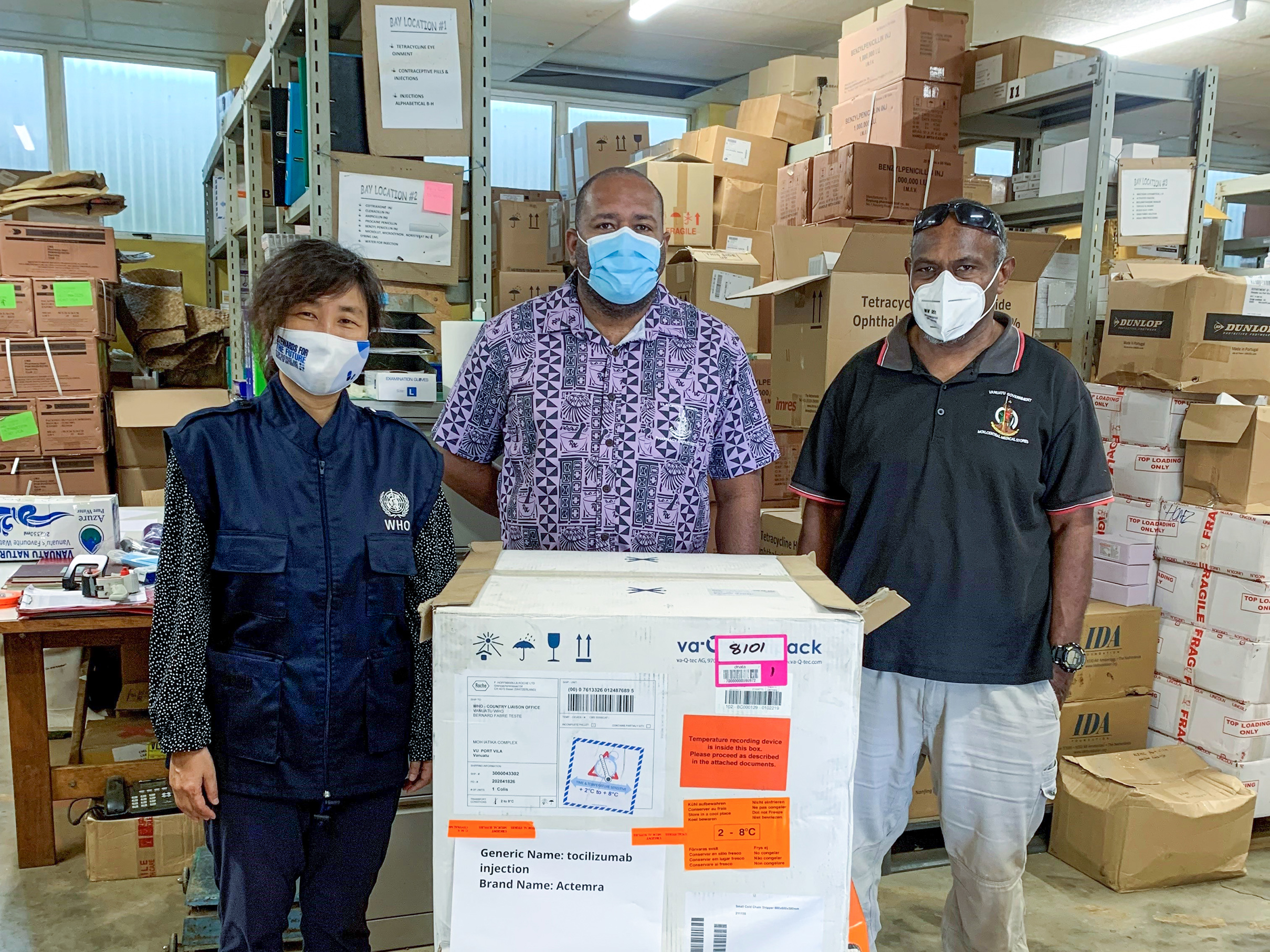 WHO Vanuatu Country Liaison Officer Dr Eunyoung Ko hands over 16,000 units of tocilizumab to the Ministry of Health. Photo: WHO